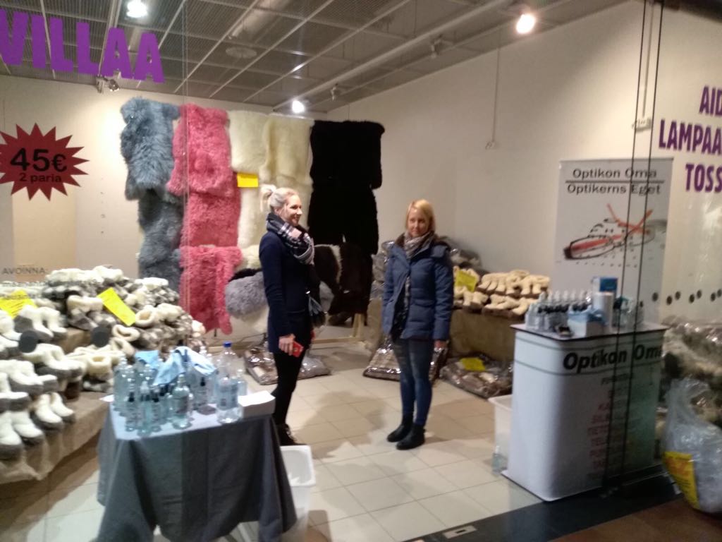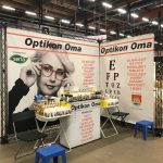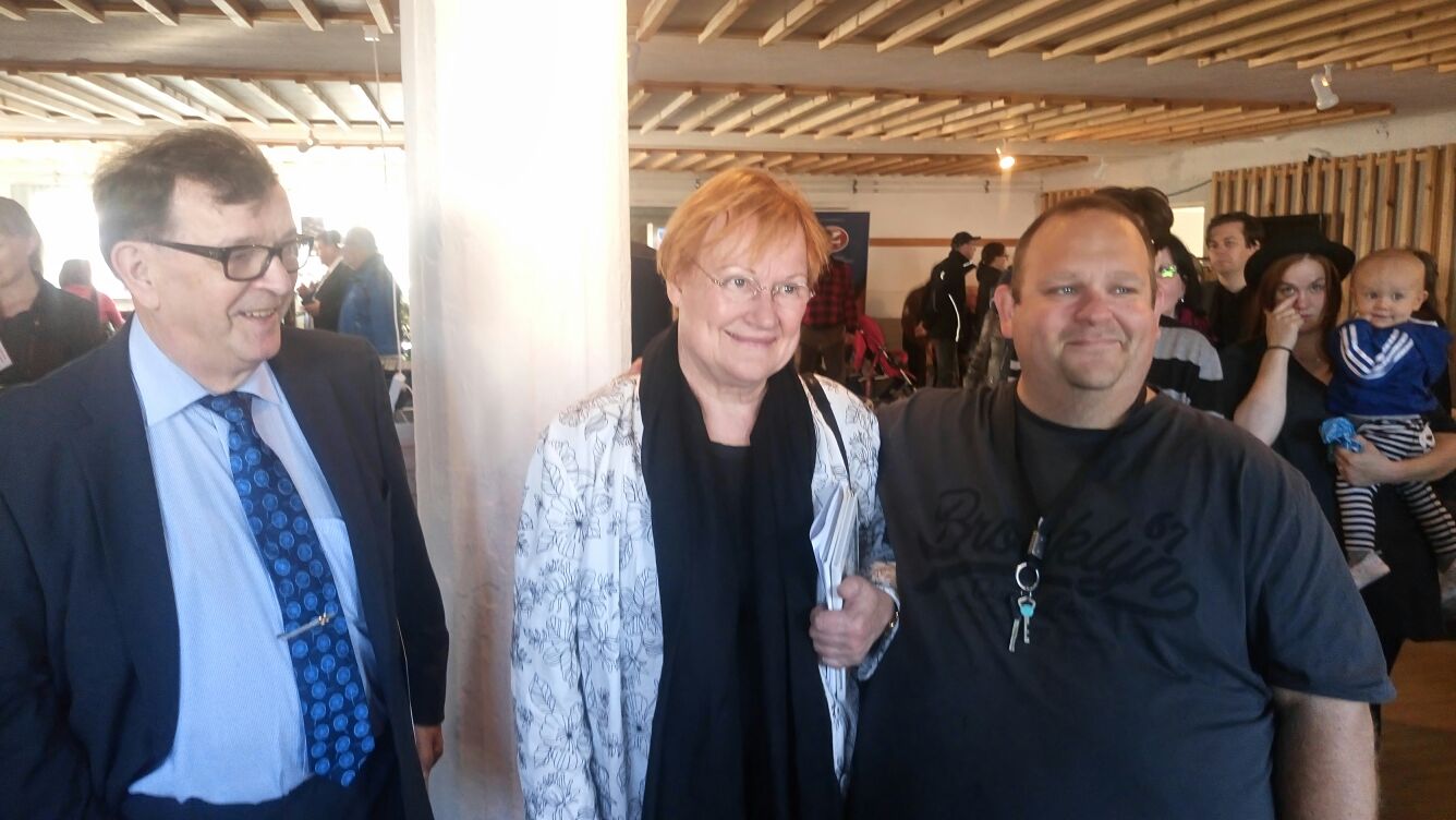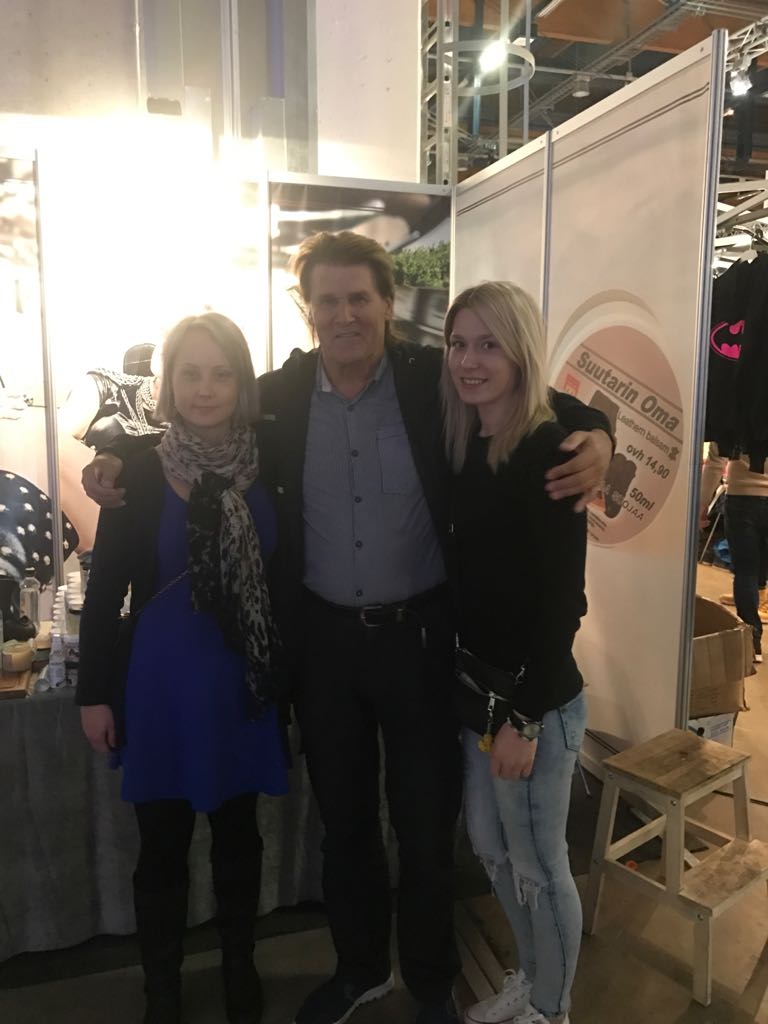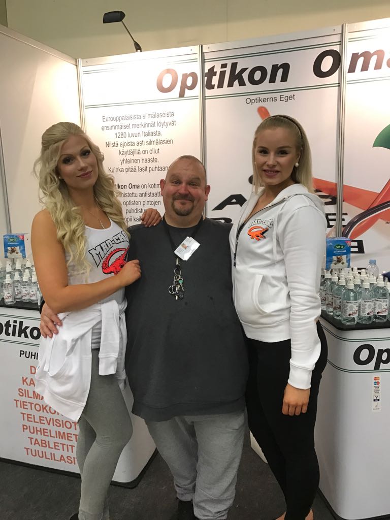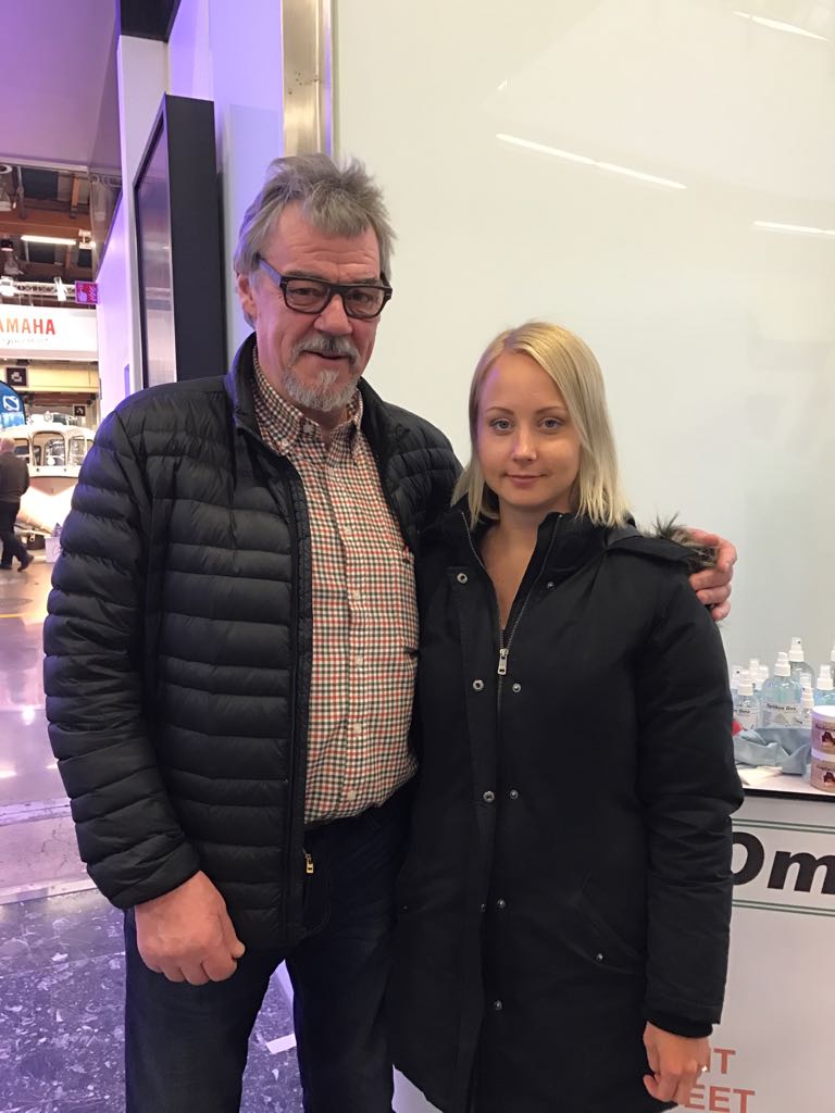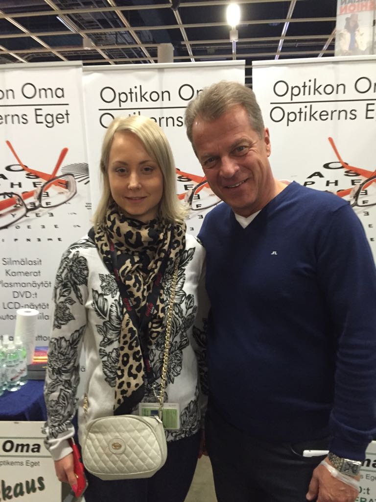 - Paavo Väyrynen ja Tarja Halonen tutustamassa Optikon Oma -tuotteisiin Keminmaan ruokamessuilla.
